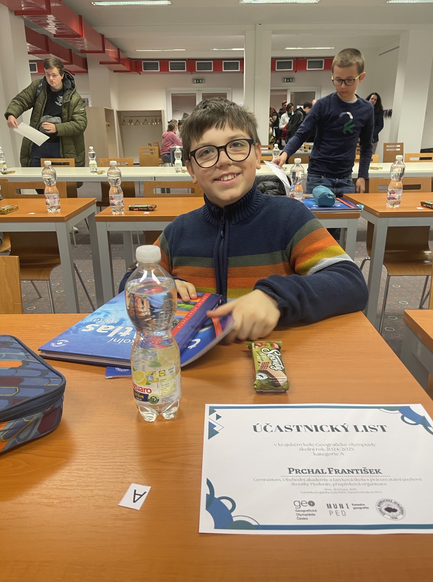 Tento šikovný žák primy zajistil naší škole další vítězství, tentokrát první místo z okresního kola Matematické olympiády v kategorii M6.